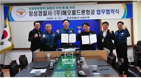 장성경찰서(서장 전병현)는 27일 관내 드론업체인 ㈜해오름드론항공과 실종자 수색 및 인명구조 등을 위해 \'정성치안\' 협약식을 체결했다.