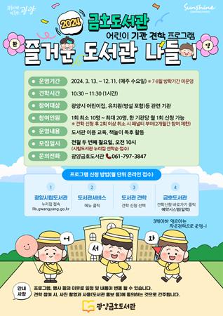 광양금호도서관은 매주 수요일 어린이집이나 유치원 등 지역 내 영유아보육기관을 대상으로 견학프로그램 ‘즐거운 도서관 나들이’를 운영한다.