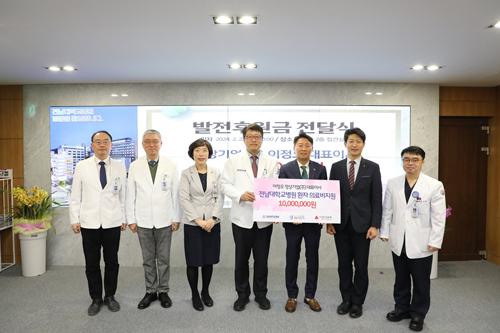 전남대학교병원은 지난 달 22일 오전 10시 행정동 2층 접견실에서 정 신 병원장과 정상기업 이정오 대표를 비롯한 김광석 공공부원장, 주성필 기획조정실장, 한재영 대외협력실장, 최명이 간호부장과 광주사회복지공동모금회 관계자 등이 참석한 가운데 발전후원금 전달식을 가졌다.
