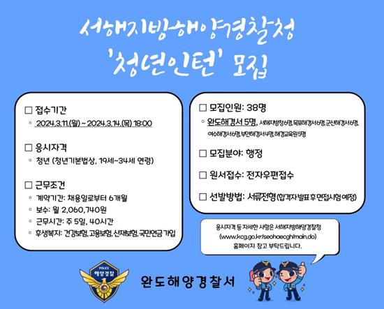 완도해양경찰서는 오는 3월 11일부터 14일까지 공공부문 청년정책 활성화를 위해 청년인턴을 모집한다고 5일 밝혔다.