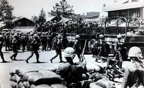 공수부대 계엄군이 1980년 5월 27일 새벽 전남도청 시민군 진압 작전을 마치고 도청 앞에 집결하고 있다. /한국일보 제공