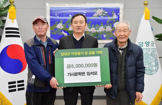 담양군은 가사문학면 임석모 씨가 지난 5일 저소득 취약계층에게 써달라며 500만 원을 기부했다고 밝혔다.
