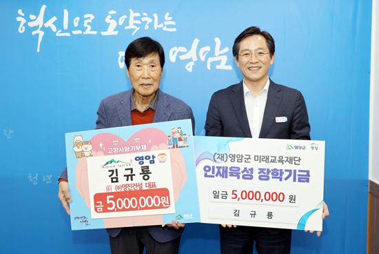 영암군 시종면 출신의 김규룡 향우가, 5일 영암군청을 찾아 고향사랑기부금과 장학금 500만원씩을 기부했다.