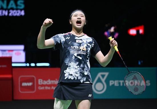 안세영이 14일 말레이시아 쿠알라룸푸르에서 열린 세계배드민턴연맹(BWF) 말레이시아 오픈 여자단식 결승전에서 타이추잉(대만)을 꺾은 뒤 환호하고 있다. 2024.01.14.
