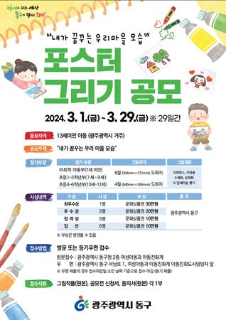 광주 동구는 아동 권리에 대한 인식 확산을 위해 아이들의 생각을 담아낸 ‘내가 꿈꾸는 우리 마을 모습’ 포스터 그리기 공모전을 오는 29일까지 진행한다고 밝혔다.
