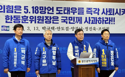 광주 동남갑 정진욱·동남을 안도걸·서구갑 조인철·서구을 양부남·광산갑 박균택 예비후보는 이날 오전 광주시의회에서 기자회견을 갖고 \"국민의힘은 5·18 망언을 한 도태우 후보를 즉각 사퇴시키고 대국민 사과를 해야 한다\"고 촉구했다.