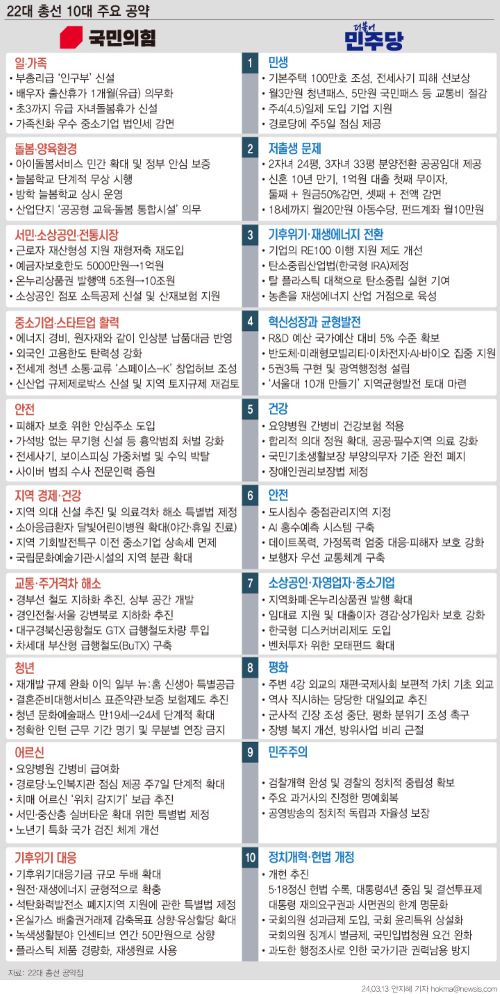 국민의힘과 더불어민주당이 4·10 총선을 앞두고 \'10대 공약\'을 발표했다.