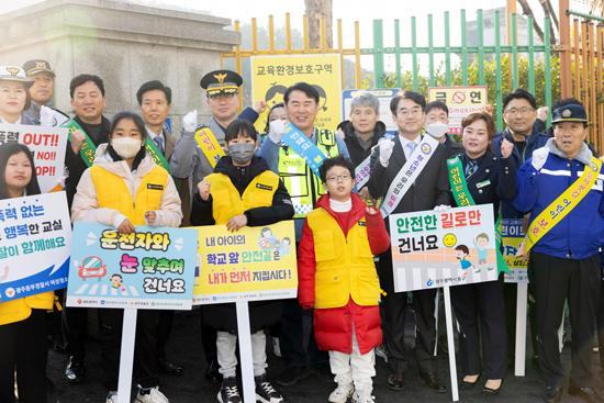 광주동부교육지원청이 13일 오전 8시 율곡초등학교 후문 앞 도로에서 교통안전캠페인을 실시했다.