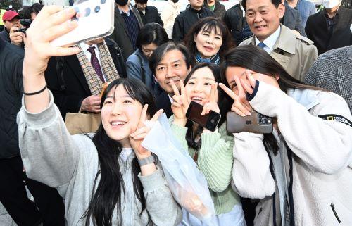 14일 광주 동구 충장로를 찾은 조국 조국혁신당 대표가 시민들과 인사를 나누며 기념사진을 찍고 있다. /뉴시스