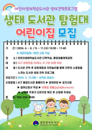 광주시 서구는 생태도서관 탐험대에 참여할 어린이집 20개소를 선착순으로 모집한다.