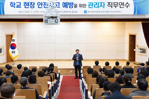 광주동부교육지원청이 13일 광주교육연수원에서 학교장과 행정실장 190명 대상 학교 현장 안전사고 예방을 위한 관리자 직무연수를 개최했다.