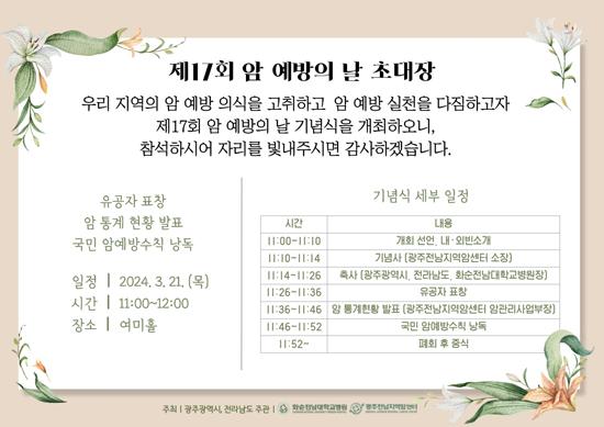화순전남대학교병원 광주전남 암센터는 오는 21일 오전 11시 병원 여미홀에서 \'제17회 암 예방의 날 기념식\'을 연다고 18일 밝혔다.
