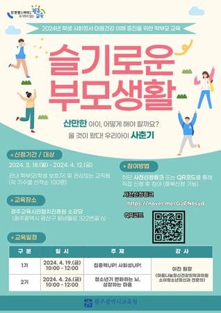 광주시교육청이 오는 4월 19일과 4월 26일 2차례 광주교육시민협치진흥원 소강당에서 학부모(보호자) 대상 학생 사회정서·마음건강 이해 증진을 위한 학부모 교육 ‘슬기로운 부모 생활’을 실시한다.