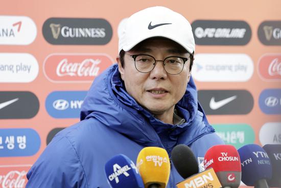 축구대표팀 황선홍 임시 감독이 18일 경기 고양종합운동장에서 2026 북중미 월드컵 아시아 2차 예선 태국과의 2연전에 대비한 훈련을 앞두고 취재진 질문에 답변하고 있다. 2024.03.18.
