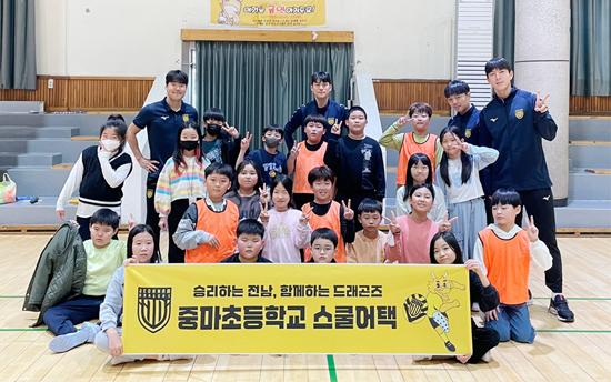 전남드래곤즈는 지역 초, 중학교를 방문하는 ‘스쿨어택’을 진행했다. 홈경기장 인근에 있는 중마초, 중동초, 동광양중학교의 4교시 수업 시간에 잠깐 방문한 선수단은 학생들과 특별한 추억을 만들기 위해 풋살경기, 피구경기 그리고 퀴즈대결 등 다양한 프로그램을 진행했다. 또한 점심식사 시간을 이용해 팬 사인회를 진행해 전교생에게 깜짝 이벤트를 선보였다.