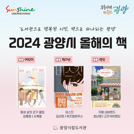 광양시가 2024 올해의 책으로 ▲어린이 부문 ‘열세 살의 걷기 클럽’(김혜정, 사계절) ▲청소년 부문‘비스킷’(김선미, 위즈덤하우스) ▲성인 부문‘카페 네버랜드’(최난영, 고즈넉이엔티) 등 총 3권을 선정했다고 20일 밝혔다.