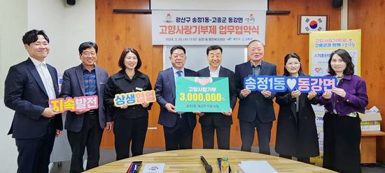 이러한 의미를 담아 송정1동 행정복지센터에서 열린 이날 협약식에서는 송정1동과 동강면 직원 30여 명의 자발적인 동참으로 300만 원의 고향사랑기부금을 상호 기탁했다.