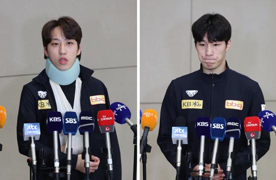 네덜란드 로테르담에서 열린 2024 국제빙상경기연맹(ISU) 세계 쇼트트랙 선수권대회를 마친 박지원(왼쪽 사진)과 황대헌이 19일 오후 인천공항 2터미널을 통해 귀국하며 취재진과 인터뷰를 하고 있다. 박지원은 이틀 연속 황대헌의 반칙으로 메달권 진입에 실패했다. 2024.03.19.