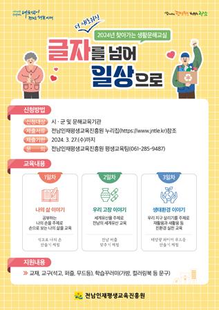 전남도와 전남인재평생교육진흥원은 교육 기회를 놓친 도민을 대상으로 글자 해득을 넘어 일상생활에 필요한 기초생활능력 향상을 위한 찾아가는 생활문해교실을 운영할 기관을 모집한다고 밝혔다.