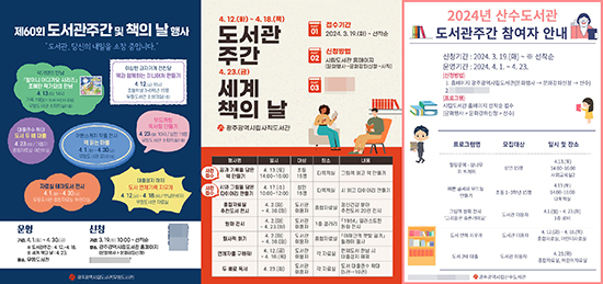 광주시립도서관(무등·사직·산수)은 제60회 도서관주간(4월12~18일)과 책의 날(4월23일)을 맞아 \'도서관, 당신의 내일을 소장 중입니다\'라는 주제로 다양한 독서문화 행사를 진행한다고 24일 밝혔다.