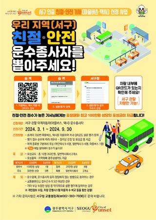 광주시 서구가 대중교통 서비스 향상과 교통이용 불편사항 예방을 위해 ‘친절·안전 기사’를 선정한다.
