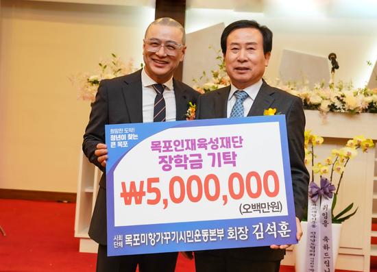 제12대 목포미항가꾸기시민운동본부 김석훈 회장이 목포인재육성재단에 우수 인재 양성을 위한 장학기금 500만원을 기탁했다.