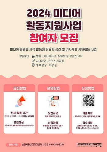 순천시영상미디어센터는 \'2024 미디어활동 지원사업\'을 운영한다고 밝혔다.