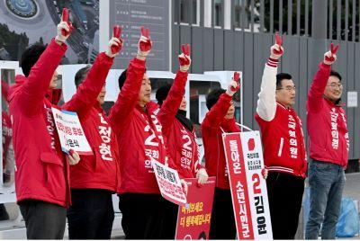 후보들은 \"2번\", \"파이팅\" 구호를 외치면서 총선승리를 다짐했다.
