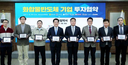 전남도는 28일 도청 서재필실에서 ㈜웨이브피아, 제엠제코㈜, ㈜인프리즘, ㈜선코리아, 그릿씨아이씨㈜, ㈜올인텍, ㈜코스텍시스(서면) 등 화합물반도체 7개 기업과 1340억 원 규모의 투자협약을 체결했다. 이들 기업은 무안 항공정비(MRO) 산단을 중심으로 화합물반도체 생태계 조성에 힘을 모으기로 했다.