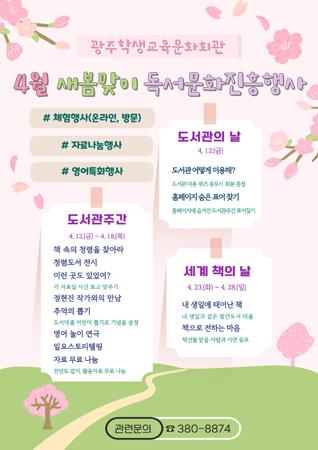 광주학생교육문화회관(이하 학생교육문화회관)은 4월 도서관의 날과 도서관주간, 세계 책의 날을 기념해 ‘독서문화진흥행사’를 진행한다.