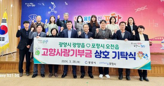 광양시 광양읍은 경북 포항시 오천읍사무소에서 고향사랑기부제의 성공적인 정착과 자매결연도시의 상생·발전을 위해 포항시 오천읍과 상호기부에 동참했다고 밝혔다.