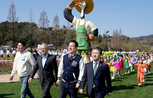 순천만 국가정원 개장식이 \'우주인도 놀러오는 순천\'이란 주제로 1일 순천만 국가정원 스페이스허브(기존 남문광장)에서 개최된 가운데 내·외빈들이 행사장에 입장하고 있다. 왼쪽부터 노관규 순천시장, 유인촌 문화체육관광부장관, 김영록 전남지사. 남성현 산림청장. /전남도 제공
