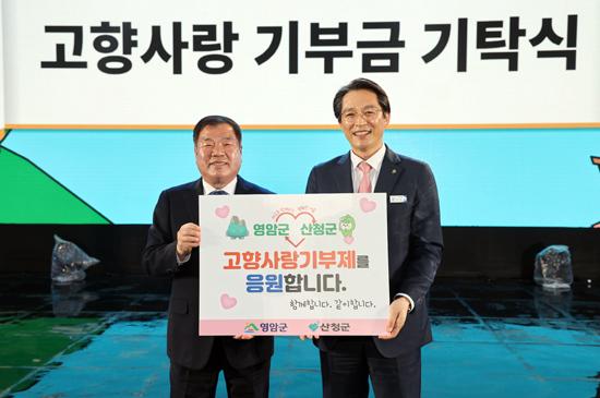 영암군이 3월 28일 영암왕인문화축제장에서 자매결연도시인 경남 산청군과 2년 연속 고향사랑 상호기부를 실시했다.