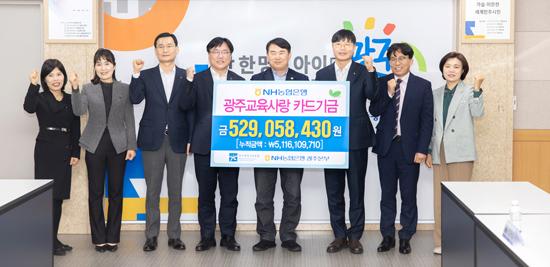 광주시교육청이 1일 NH농협은행으로부터 ‘광주교육사랑카드’사용으로 발생한 적립금 5억2905만 원을 전달받았다. 이번 전달된 적립금은 시교육청 예산에 포함돼 앞으로 광주 학생들을 위한 다양한 사업에 활용될 예정이다.