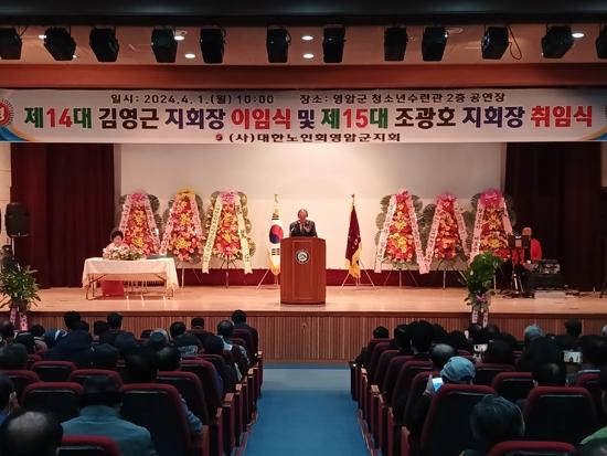 (사)대한노인회 영암군지회가 지난 1일 영암군청소년수련관에서 회원 등 300여 명이 참석한 가운데 \'제14대 김영근 지회장 이임식 및 제15대 조광호 지회장 취임식\'을 개최했다.