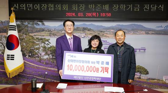 신안군 신의면이장협의회 박준배 회장은 지난 3월 28일 신안군청을 방문해 지역인재육성을 위해 사용해 달라며 (재)신안군장학재단에 1000만 원의 장학기금을 기탁했다.