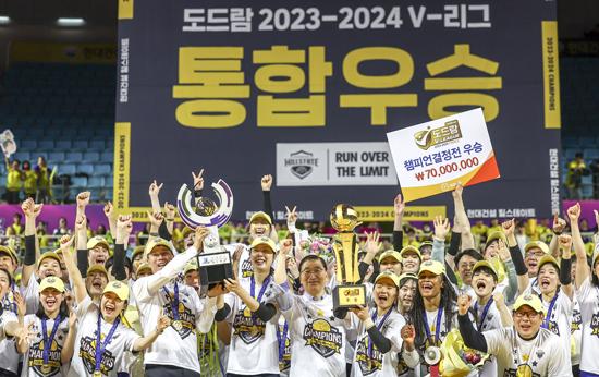 챔피언결정전 1, 2, 3차전을 모두 풀 세트 끝에 이긴 현대건설은 8시즌 만에 통산 세 번째 왕좌에 올랐다. 두 번째 통합 우승도 차지했다.