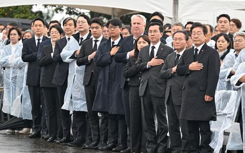 여야 지도부가 3일 오전 제주 4·3 평화공원에서 열린 제76주년 제주 4·3 희생자 추념식에 국민의례를 하고 있다. /제주도사진기자회