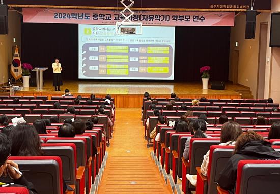 광주서부교육지원청이 지난 2일 광주학생독립운동기념회관 강당에서 서부 관내 중학교 1학년 학부모 150여 명 대상으로 ‘2024학년도 중학교 교육과정(자유학기) 학부모 연수’를 실시했다.