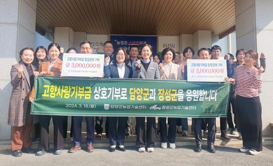 군에 따르면, 최근 장성군 농업기술센터와 담양군 농업기술센터가 상호 고향사랑기부를 실천했다. 양 기관은 평소에도 활발한 협력과 소통으로 ‘이웃사촌’ 같은 관계를 유지해 왔다. 담양군과의 고향사랑기부는 지난해에 이어 이번이 두 번째다.