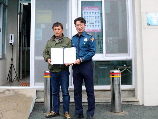 완도경찰서는 뺑소니 후 도주한 운전자 A씨를 검거하는데 기여한 택시기사 B씨에게 표창장을 수여했다. /완도경찰서 제공