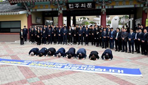 제22대 국회의원 선거에서 광주 지역구 8석을 모두 석권한 더불어민주당 당선인들이 11일 오전 광주 북구 운정동 국립 5·18민주묘지를 참배한 뒤 민주의 문 앞에서 광주 시민을 향해 큰절을 하고 있다.