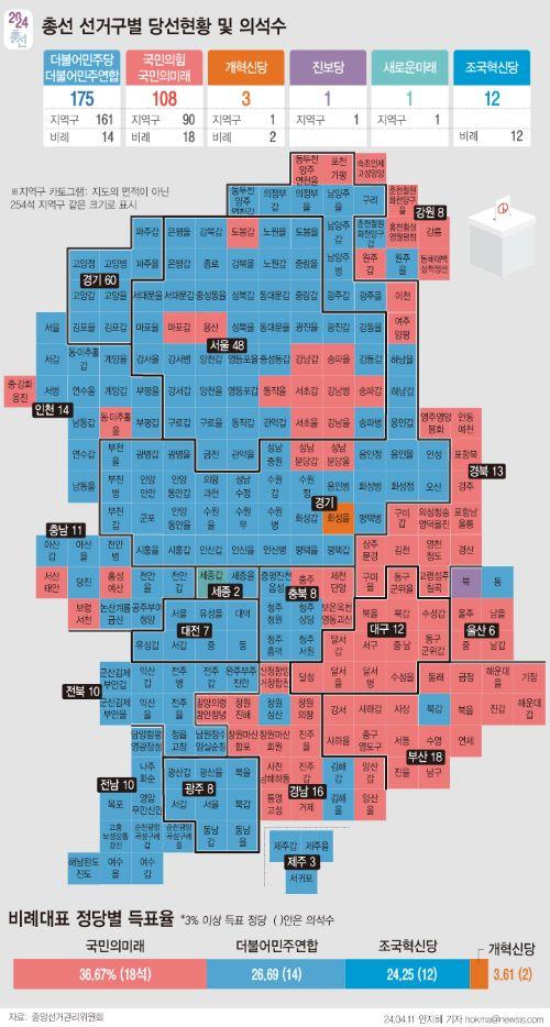 이에 전체 300석 가운데 민주당·민주연합이 175석, 국민의힘·국민의미래가 108석을 차지했다. 지역구 후보를 안 낸 조국당은 비례로만 12석을 확보 \'원내 제3당\'이 됐다, 개혁신당은 지역구 1석을 포함해 3석을 안았다.