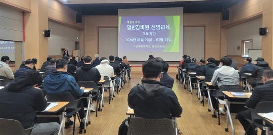 경비원 업무에 종사하기 위해서는 ‘경비업법’에 따라 대통령령으로 정하는 교육 기관에서 24시간의 교육을 이수해야 하며 60점 이상을 받아야 한다. 경찰청 지정 교육기관에서 1일 8시간씩, 총 3일간 10과목을 이수해야만 교육 이수증을 받을 수 있다.