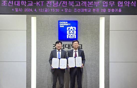 김진철 KT 전남전북고객본부장(오른쪽)과 김춘성 조선대 총장이 업무협약을 체결하고 있다. /KT 전남전북광역본부 제공