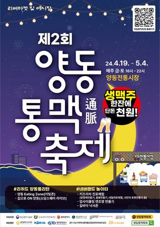 양동통맥축제의 분위기를 한껏 끌어올릴 프로그램도 다채롭다. 주무대에서는 매주 금·토요일 오후 4~5시 양동전통시장 관련 주제로 퀴즈쇼가 진행되며, 축제가 시작되는 19일과 마지막 날인 5월4일에는 유튜브 생중계를 통해 시청자들의 댓글로 음식을 조리하는 ‘AI(양동이로봇) 랜선 키친’이 펼쳐진다. 또한 축제 기간에 시장통 양동이 노래방, 레트로 감성을 살린 ‘통맥 DJ EDM’파티, 통맥버스킹, 온라인 디지털커머스 ‘집으로 ON 양동’, 보물찾기 이벤트 등 축제 방문객과 시장상인들이 함께 하는 코너도 진행된다. 특히 ‘같이가치 올림픽’에서는 상인들이 직접 소개하는 가게, 방문객들이 알려주는 숨은 맛집, 양동 통맥송 등을 주제로 숏폼 챌린지가 이어진다.