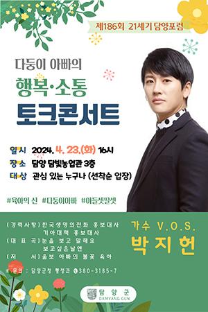 6남매를 키우며 겪은 생생한 경험담과 육아 노하우, 양육의 보람과 기쁨 등에 관한 이야기를 나누며, V.O.S의 대표곡을 들을 수 있는 힐링의 시간도 함께 진행돼 육아와 일상에 지친 군민들에게 소통과 공감을 끌어낼 것으로 기대된다.