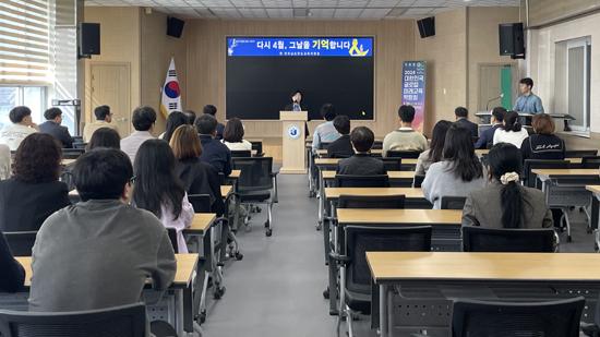지원청 대회의실에서 70여 명의 직원이 모여 세월호 참사의 아픔을 되새기며 다시는 아픔이 반복되지 않도록 교육환경의 안전을 위해 최선을 다할 것을 다짐하는 자리를 마련했다.