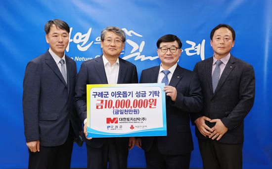 대한토지신탁 박종철 대표이사는 “이번 성금이 어려운 이웃에게 조금이나마 도움이 될 수 있기를 바란다”며 “앞으로도 어려운 이웃들의 주거의 질을 높이고 생활환경을 개선하는 등 살기 좋은 구례를 만들기 위해 최선을 다하겠다”고 말했다.