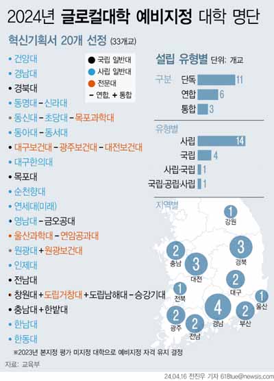 교육부와 글로컬대학위원회는 16일 오전 정부서울청사 별관에서 올해 글로컬대학 예비지정 평가 결과 단독·공동으로 신청한 65곳 중 20곳을 선정했다고 발표했다. 대학 수로는 신청 109개교 중 33개교가 들었다.
